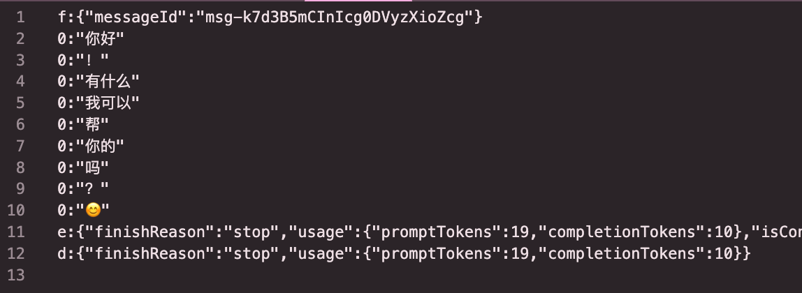 0:(Text Delta):代表文本增量。你可以看到 “你好”、”!” 是被切分成一个个小块传回来的。这就是为什么前端能实现“打字机”效果——因为数据本身就是一点点蹦出来的。d:/e:(Data/End):代表元数据。比如usage告诉我们这次消耗了多少 Token(钱),finishReason告诉我们 AI 是说完了还是被截断了。