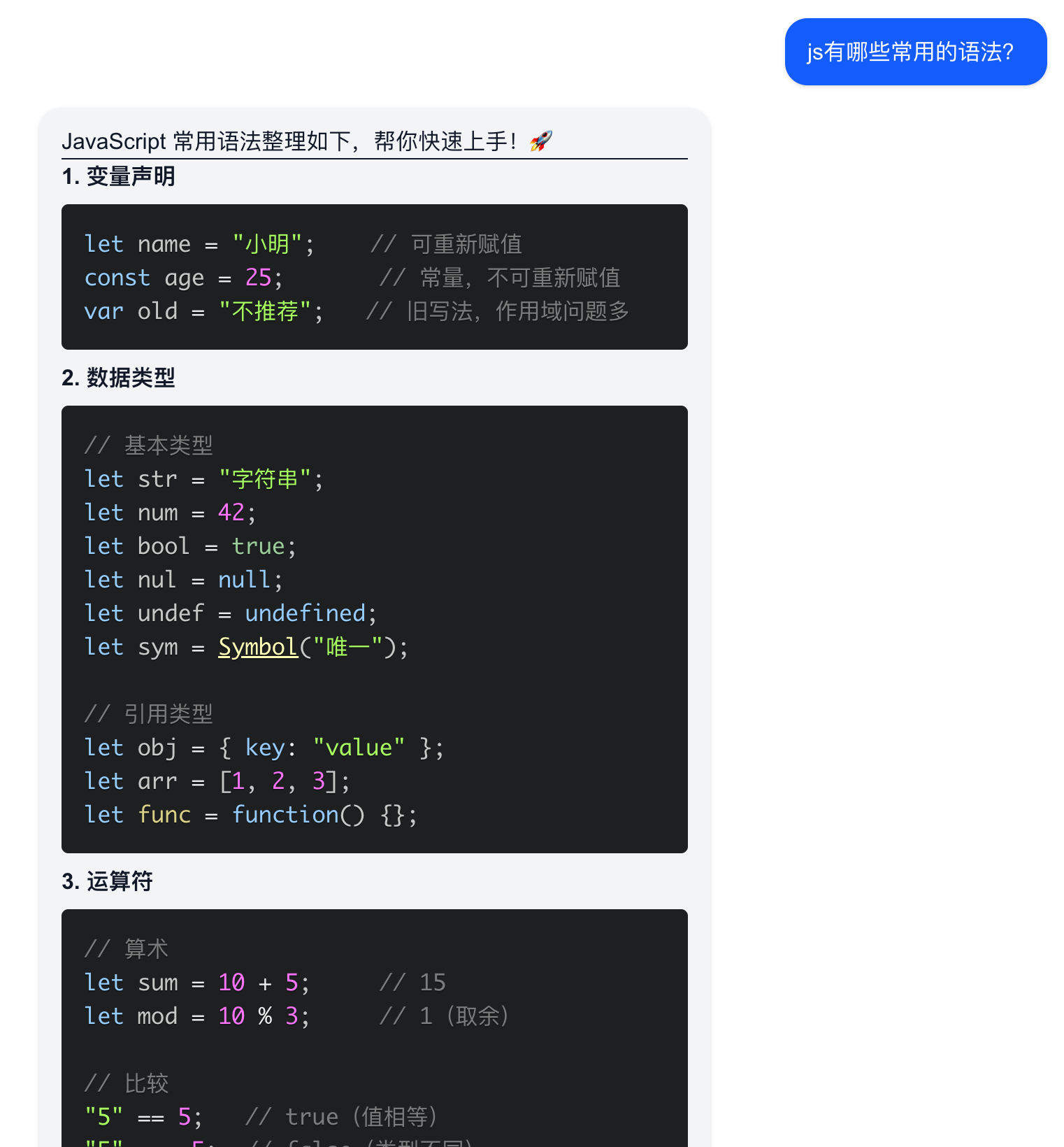 return ( <div className="flex flex-col w-full h-screen max-w-3xl mx-auto bg-background"> {/* 聊天记录区域 */} <div className="flex-1 overflow-y-auto p-4 space-y-4 pb-32"> {messages.map((m) => ( <div key={m.id} className={`flex w-full ${ m.role === "user" ? "justify-end" : "justify-start" }`} > <div className={`max-w-[85%] rounded-2xl px-4 py-3 shadow-sm ${ m.role === "user" ? "bg-blue-600 text-white" // 👤 用户:蓝底白字 : "bg-gray-100 dark:bg-gray-800 text-gray-900 dark:text-gray-100" // 🤖 AI:灰底黑字 }`} > {m.role === "user" ? ( // 用户消息通常只是纯文本,直接渲染看起来更干净 <div className="whitespace-pre-wrap">{m.content}</div> ) : ( // AI 消息才需要 Markdown 渲染 (代码高亮、表格等) <MarkdownRenderer content={m.content} /> )} </div> </div> ))}